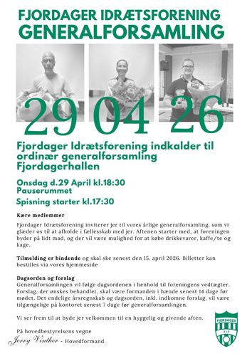 Forinden generalforsamlingen er Fjordager Idrætsforening vært ved lidt mad. Der kan købes kølige drikkevarer samt kaffe/te og kage.Spisningen starter kl. 17.30.Det er bindende tilmelding senest den 15.04.26 via billetter her på hjemmesiden!